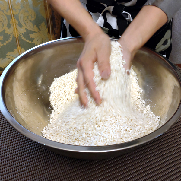 コウジ菌が付着するとふわふわと胞子が出来る様子が米に花が咲いたように見えることから「米」偏に「花」で「糀」になったといわれています。